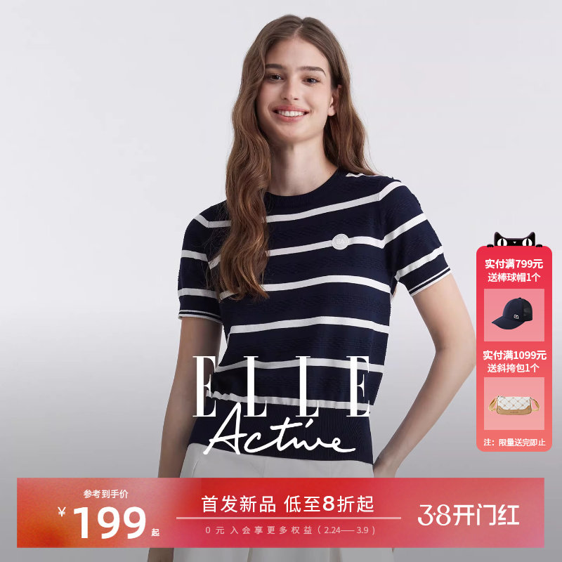ELLE Active高智老钱冰丝条纹针织衫简约高级短袖T恤上衣修身显瘦