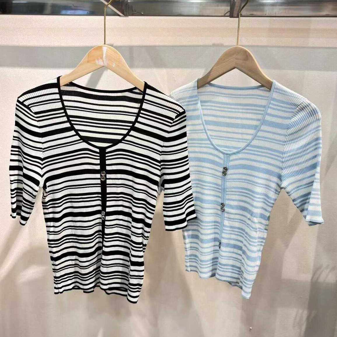 亏本清仓!雅Y U型领条纹高弹柔软轻薄修身冰丝针织衫春夏装新款