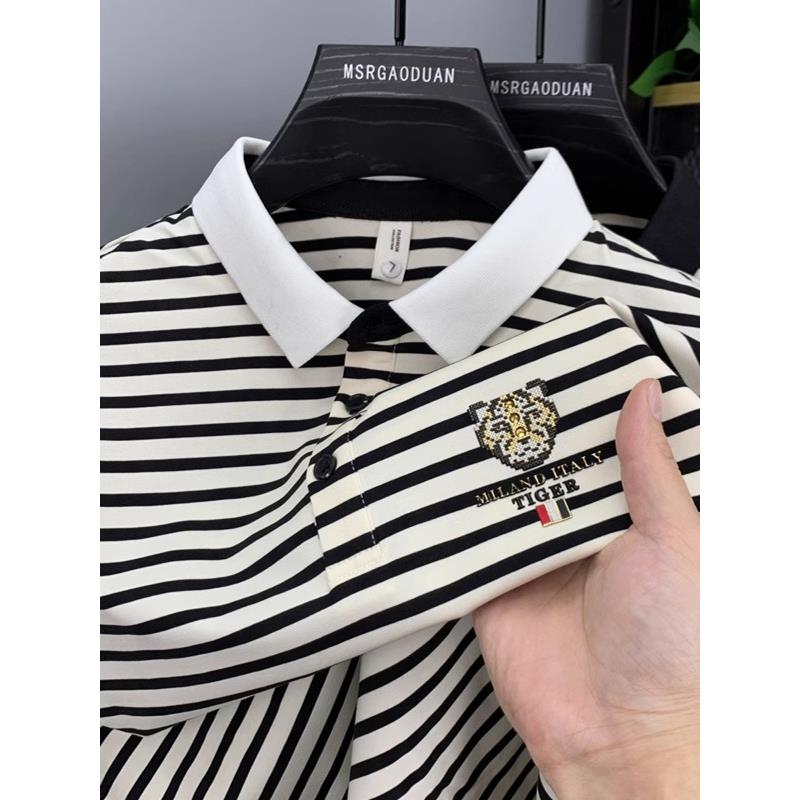 丝光棉男短袖t恤2024新夏季黑白条纹半袖Polo衫冰丝透气t恤新潮