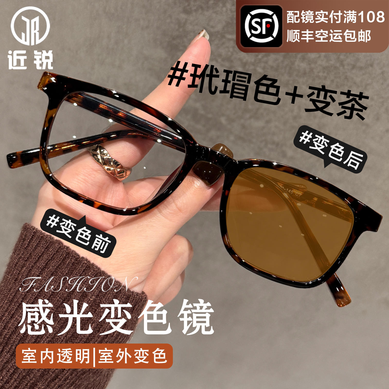 变色近视眼镜女超轻潮冷茶色透明框ins高颜值大框显瘦素颜平光镜