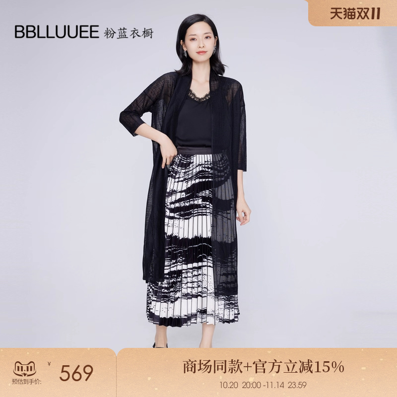 BBLLUUEE粉蓝衣橱夏日轻盈优雅黑色网纱外衫女2025夏中长款薄开衫