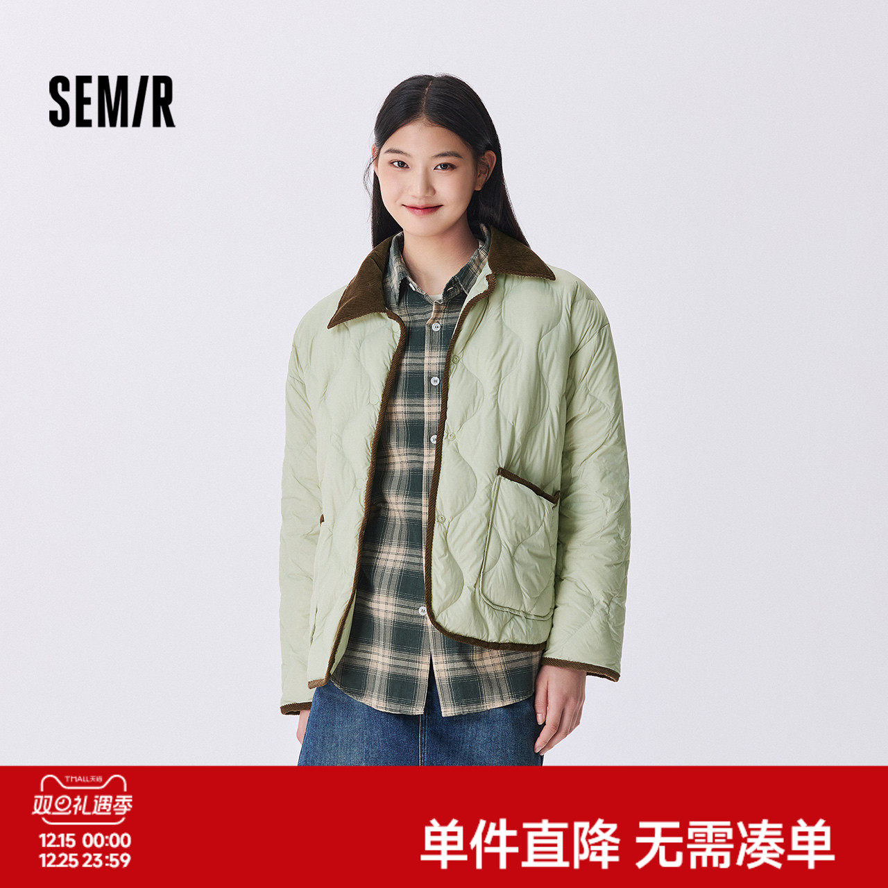 森马羽绒服女中长款轻薄拼接灯芯绒翻领2024冬季新款三防外套复古
