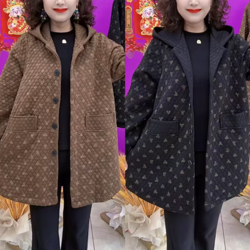 2025秋冬中老年时尚翻领压格风衣外套女中长款休闲宽松大码妈妈装