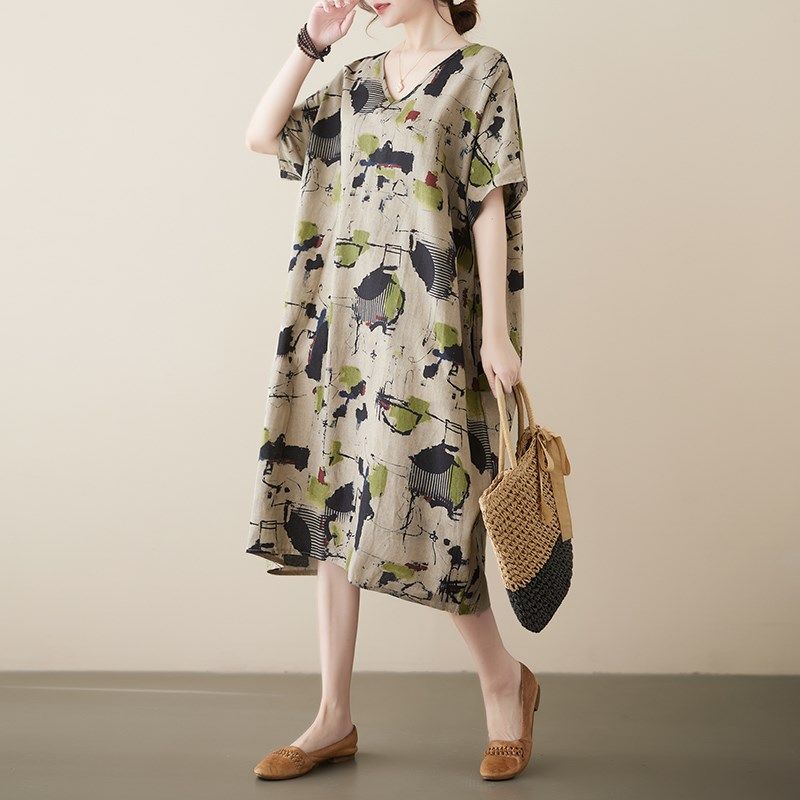 大号女装胖MM棉麻加肥加大中长款遮肉显瘦复古文艺抽象裙子连衣裙