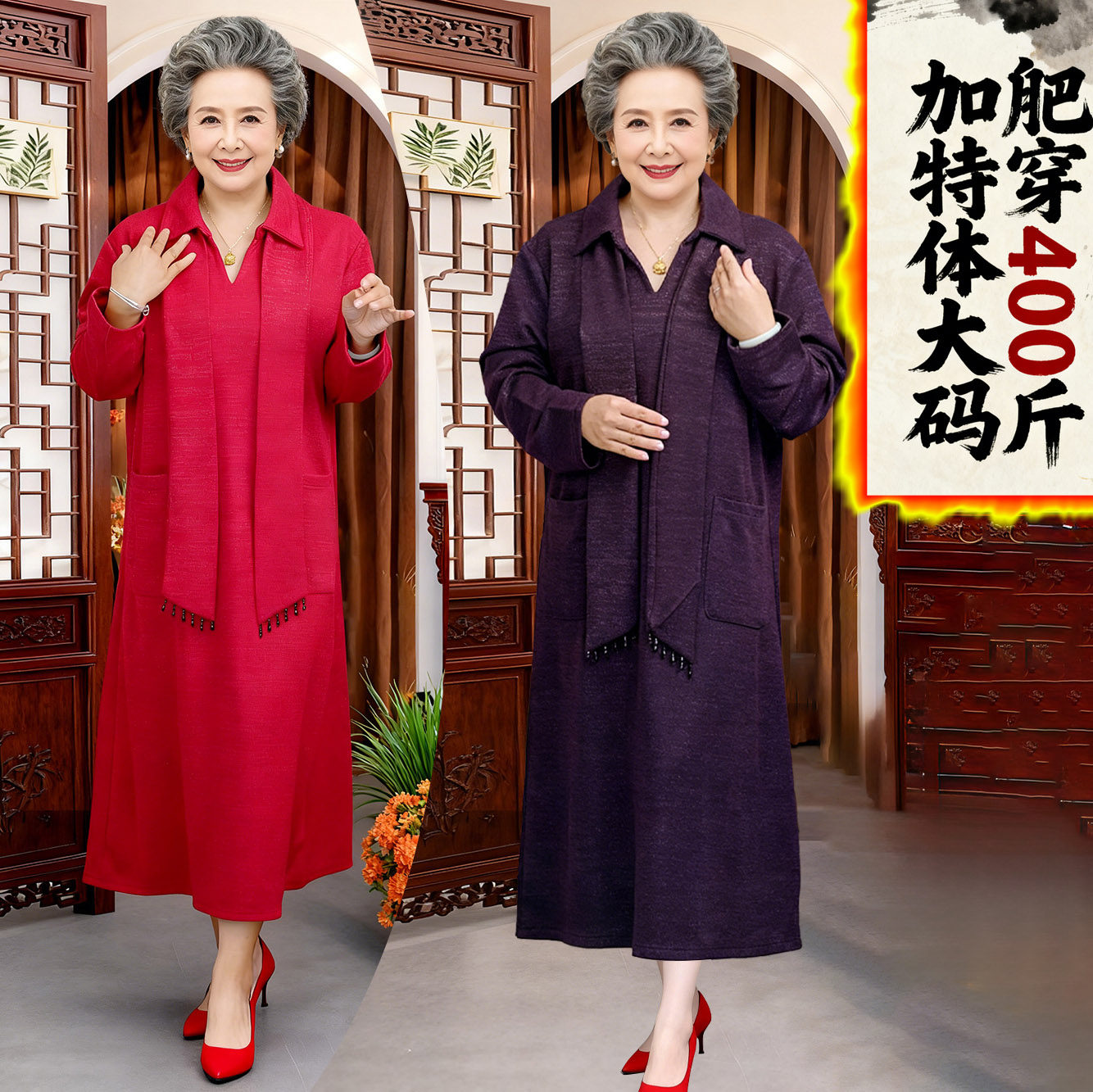 中年女装裙子胖妈妈款长袖连衣裙老年人加肥加大码喜婆婆衣服冬装