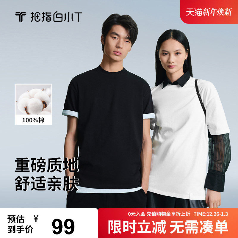 拇指白小T圆领短袖T恤男女同款中国风潮上衣夏季重磅纯棉宽松体恤