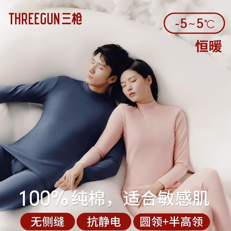 三枪内衣秋冬男纯棉半高领长袖打底厚全棉保暖女秋衣秋裤情侣套装