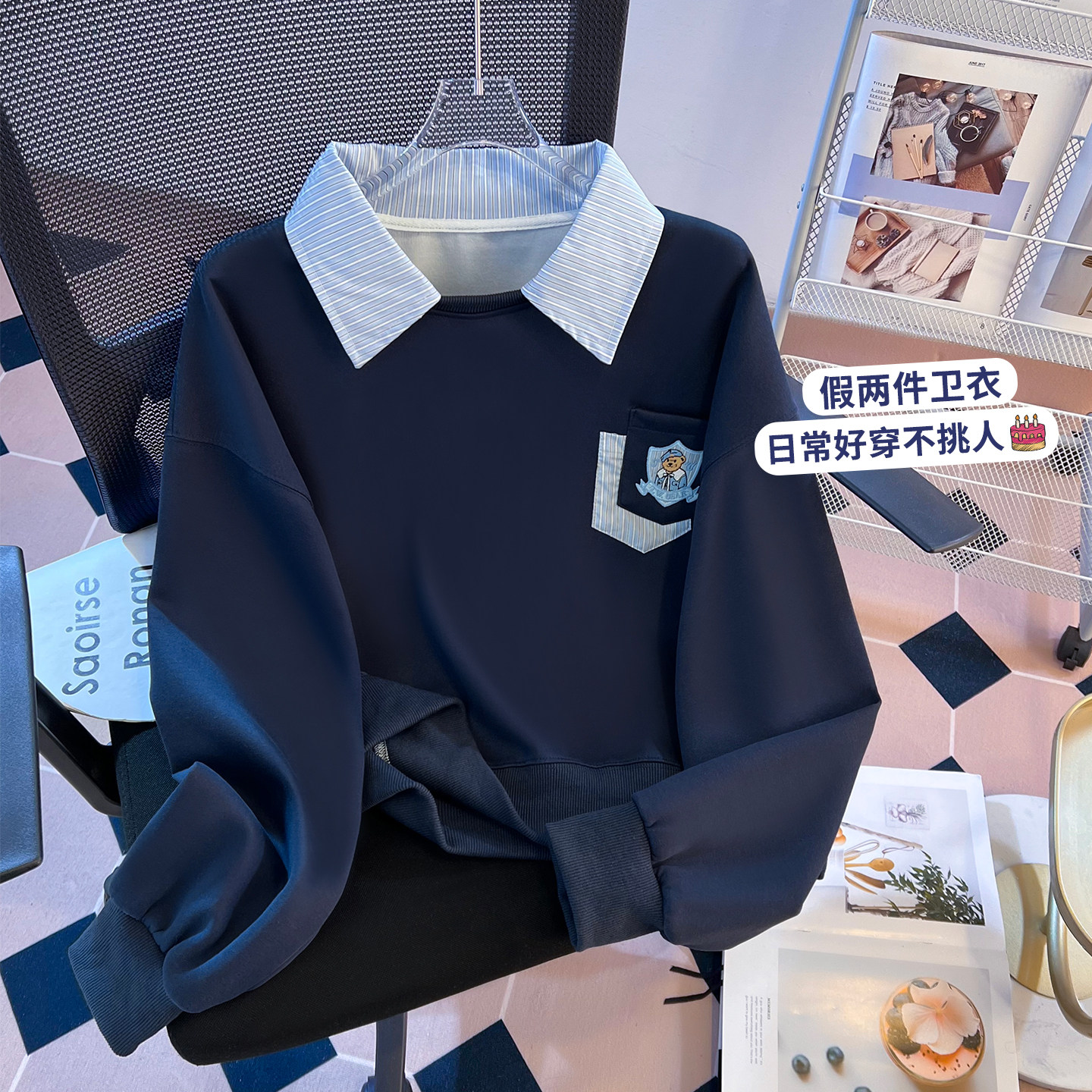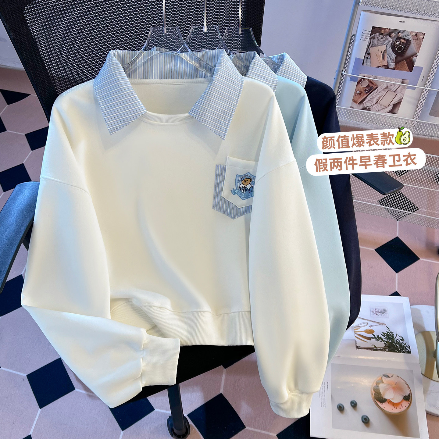 刺绣小熊翻领假两件上衣女学生春季新款减龄学院百搭纯棉短款卫衣