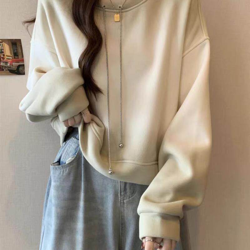 小个子圆领短款卫衣女纯棉春季新款韩版宽松百搭学生纯色长袖上衣