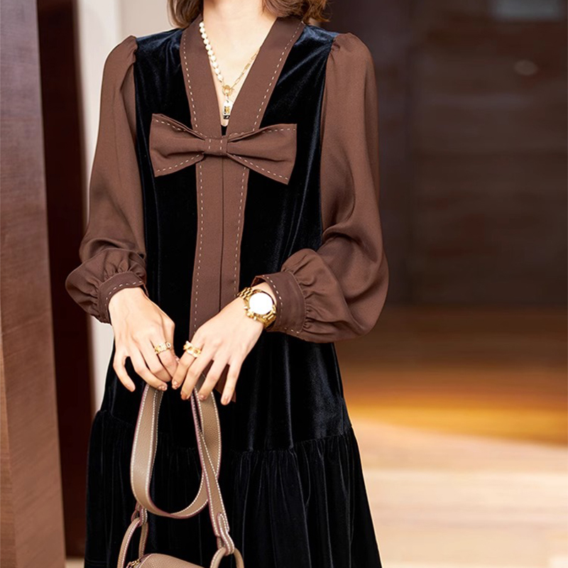 蝴蝶结假两件连衣裙女秋季2024年新款时尚欧洲站长袖大码裙子