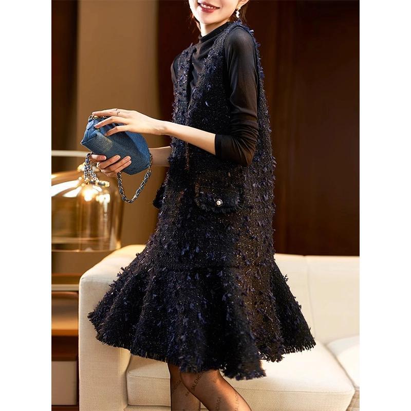 亮丝小香风背心连衣裙女2024年欧洲站气质潮春秋季新款大码中款裙