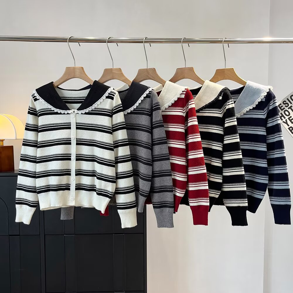 大码秋季胖mm娃娃领长袖针织衫女韩版宽松百搭显瘦开衫毛衣外套潮