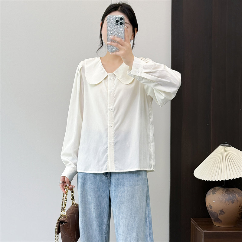 2025秋装新款白色长袖衬衫女娃娃领韩版宽松文艺百搭纯棉打底衬衣