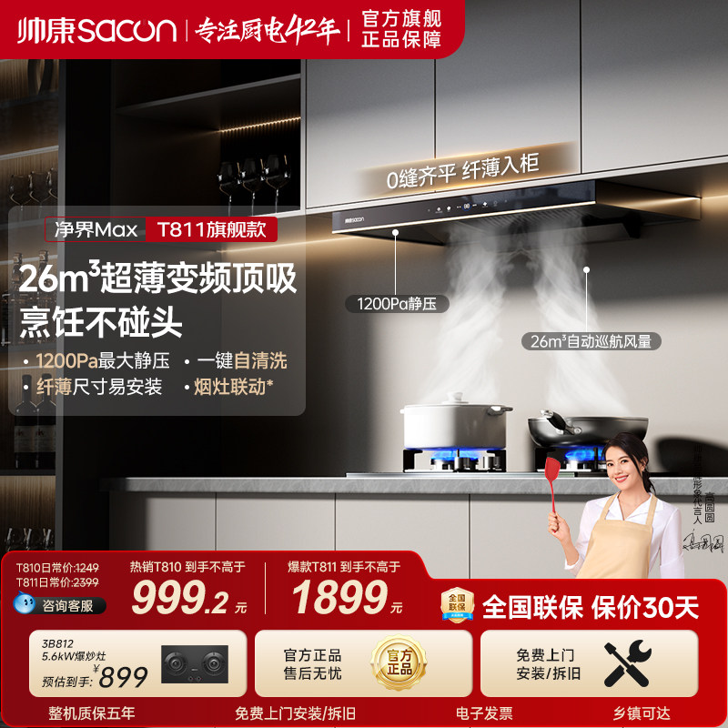 帅康T811欧式大吸力抽油烟机燃气灶套餐家用顶吸烟机以旧换新补贴