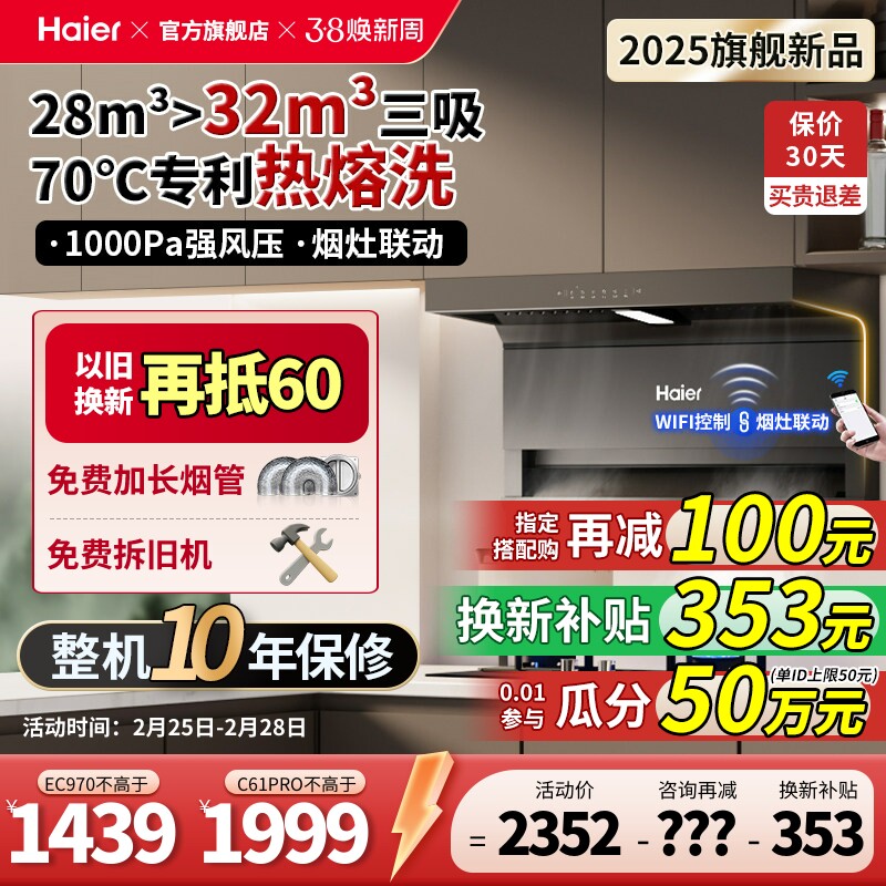 海尔抽油烟机家用28m3大吸力顶侧双吸C61pro变频吸烟机烟灶联动