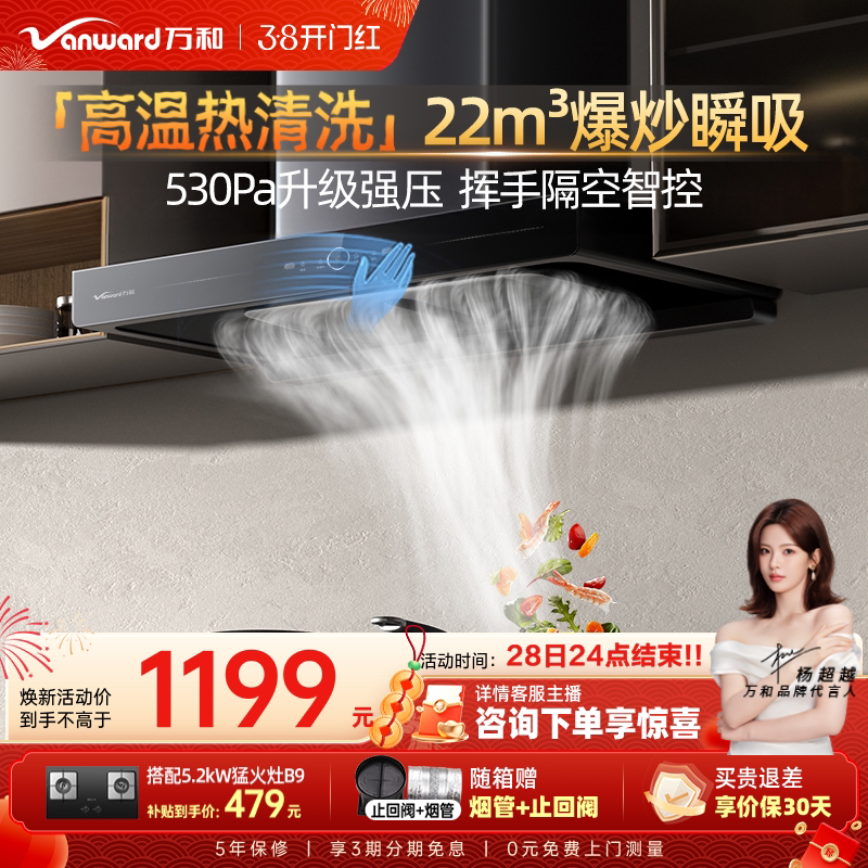 [品牌补贴]万和小双翼家用厨房大吸力自清洗顶吸式吸烟机WX536