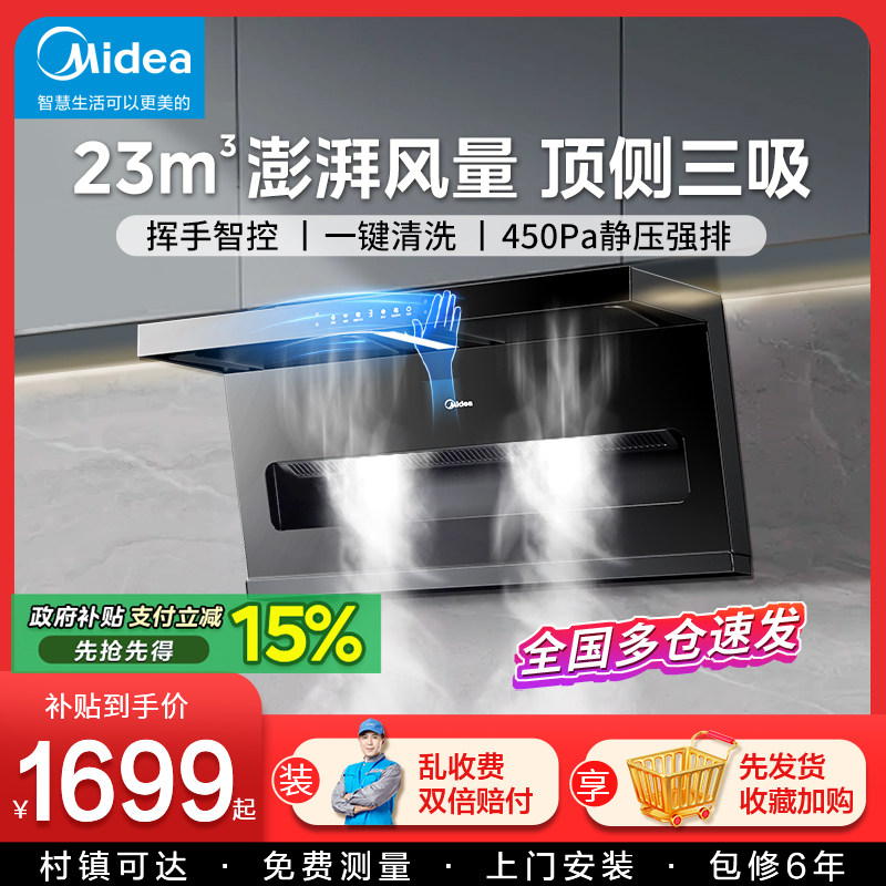美的抽油烟机顶侧三吸家用大吸力7字型顶侧双吸官方旗舰店吸烟机