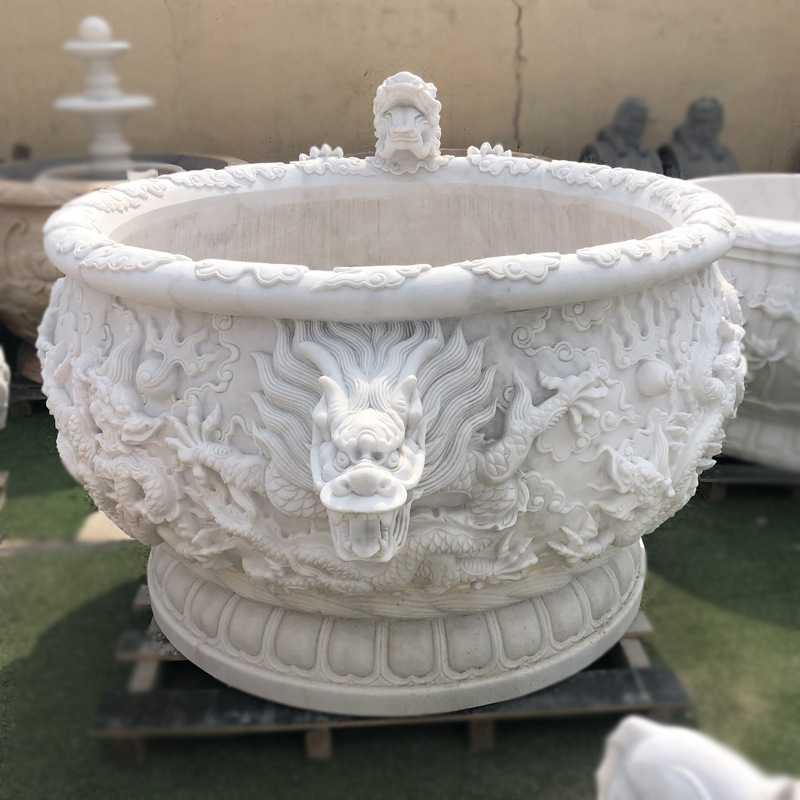 新款直销石雕鱼缸汉白玉圆形龙缸别墅庭院装饰种花摆件晚霞红石雕