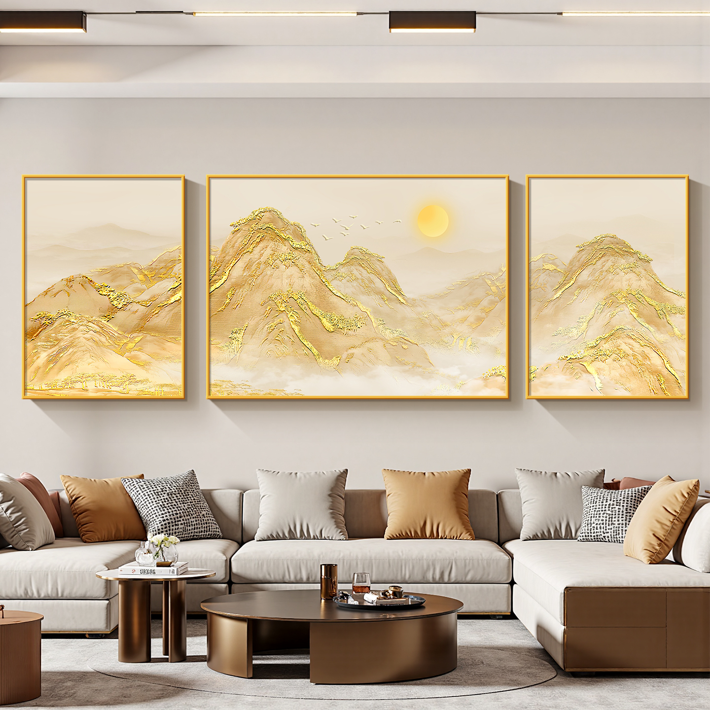 日照金山客厅沙发背景墙三联画高级感金箔装饰画现代简约招财挂画