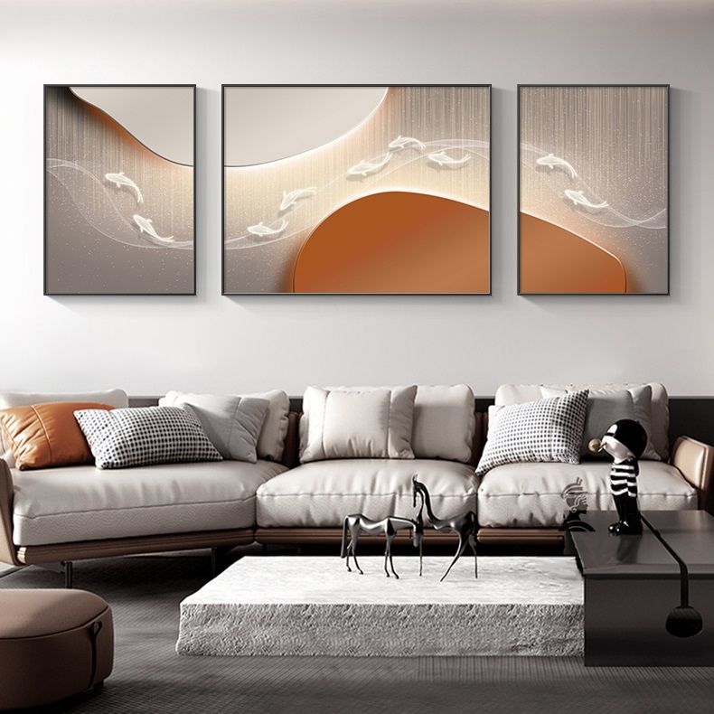 客厅装饰画沙发背景墙三联画九鱼图现代简约轻奢晶瓷画高级感挂画
