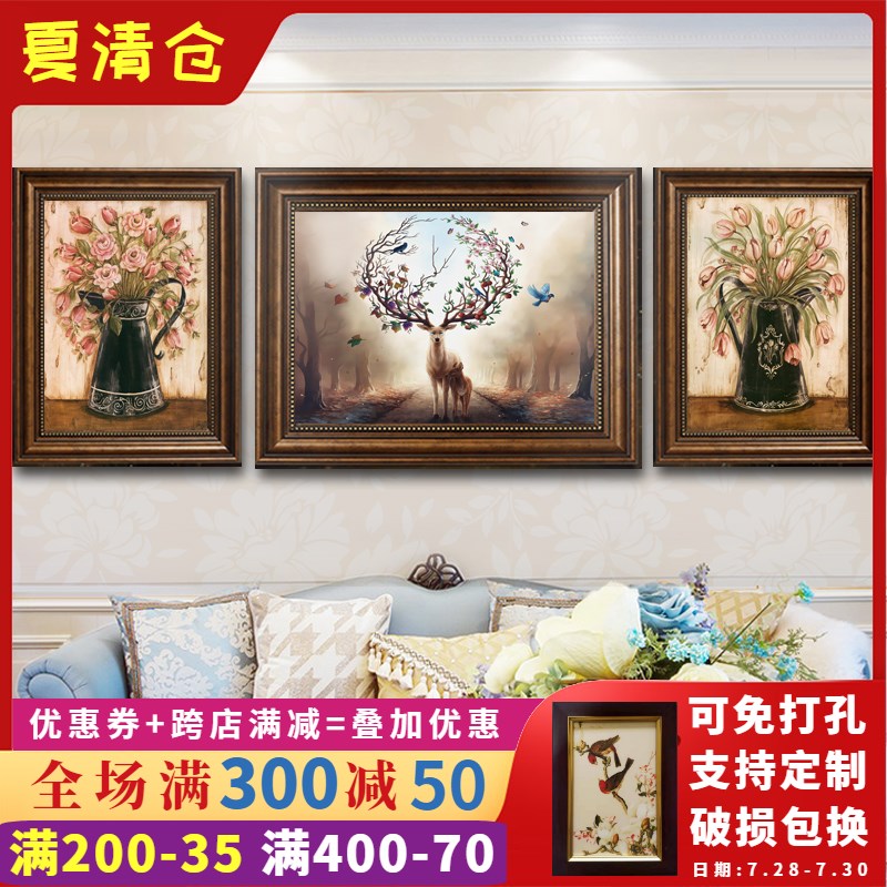 美式客厅装饰画沙发背景墙三联画欧式壁画轻奢复古风欧美挂画油画
