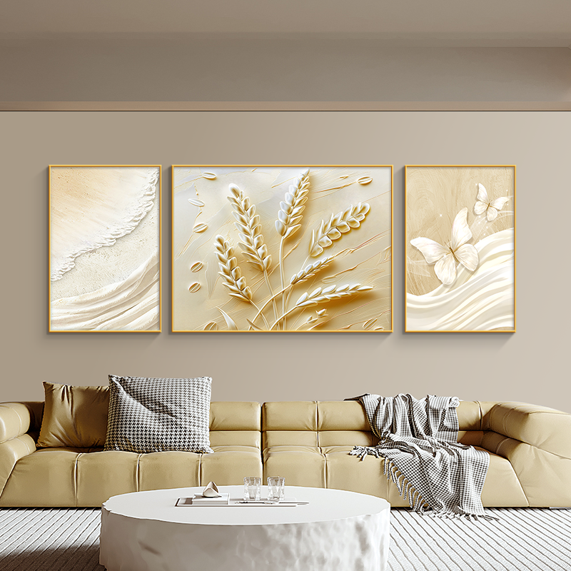 麦穗客厅装饰画奶油风肌理感蝴蝶海浪挂画高级感沙发背景墙三联画