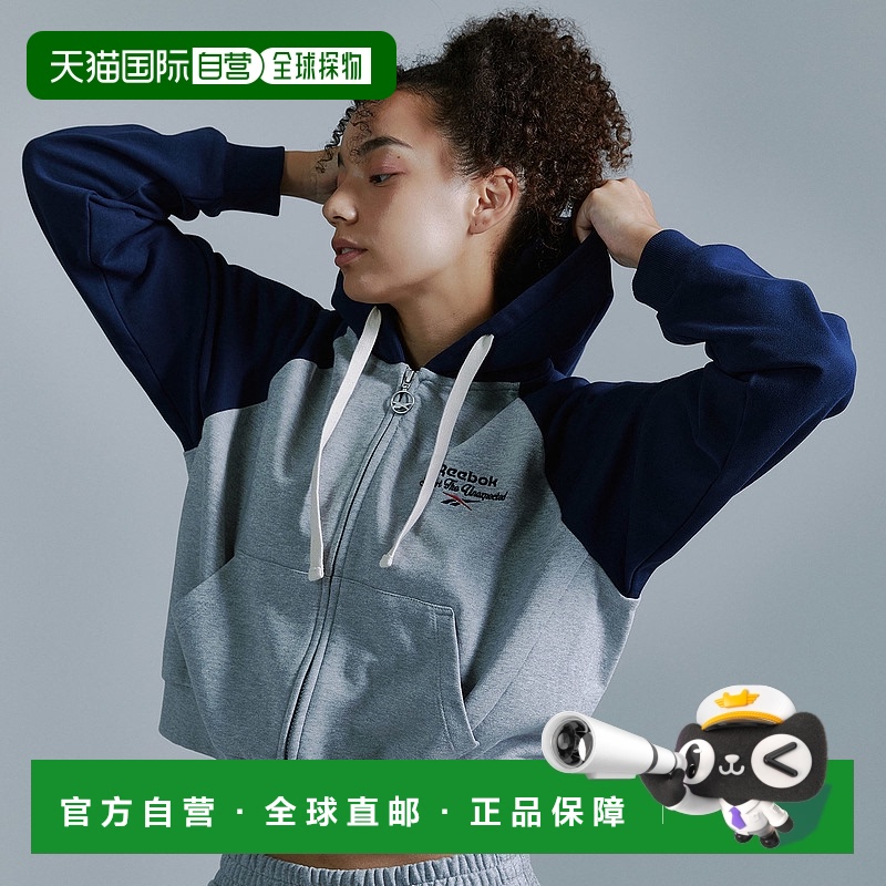 韩国直邮Reebok 纯色字母短款拉链连帽长袖卫衣 女款 黑色