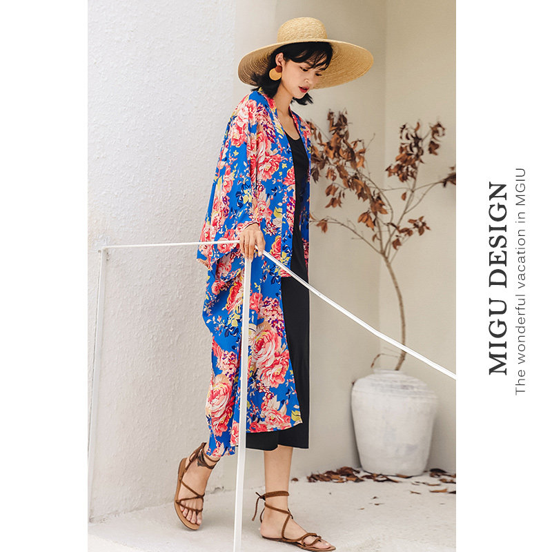 弥古雪纺防晒衣中长款开衫外套女夏季宽松空调衫印花薄款披肩上衣