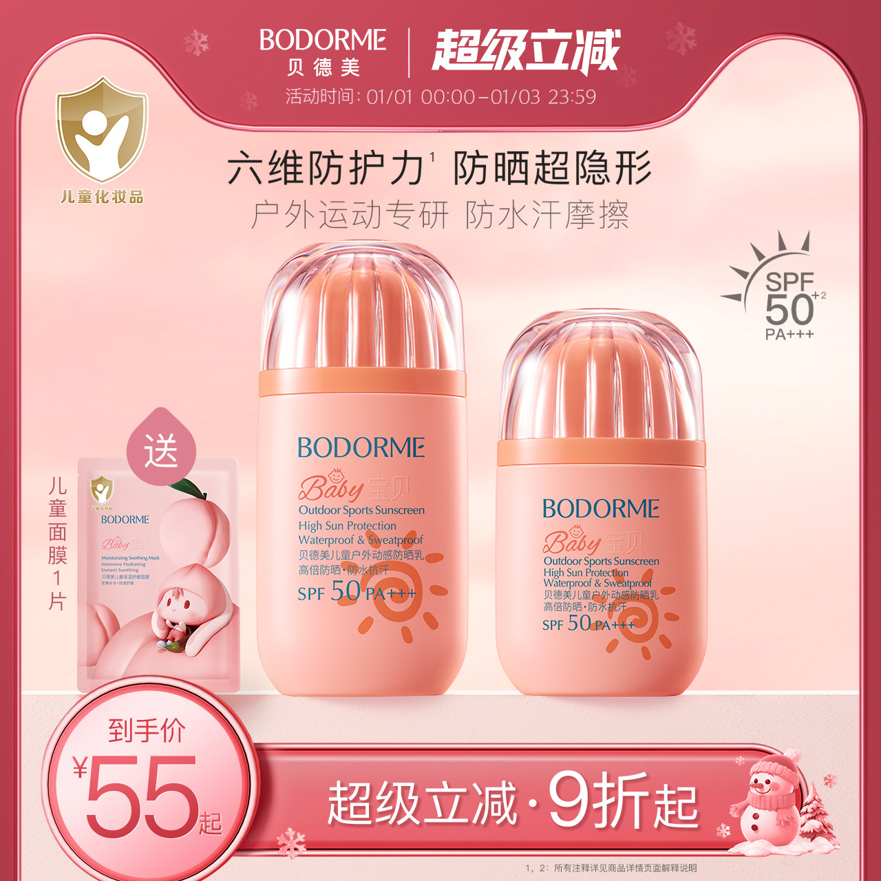 贝德美儿童防晒霜男女童防晒乳防水防汗宝宝专用隔离紫外线SPF50