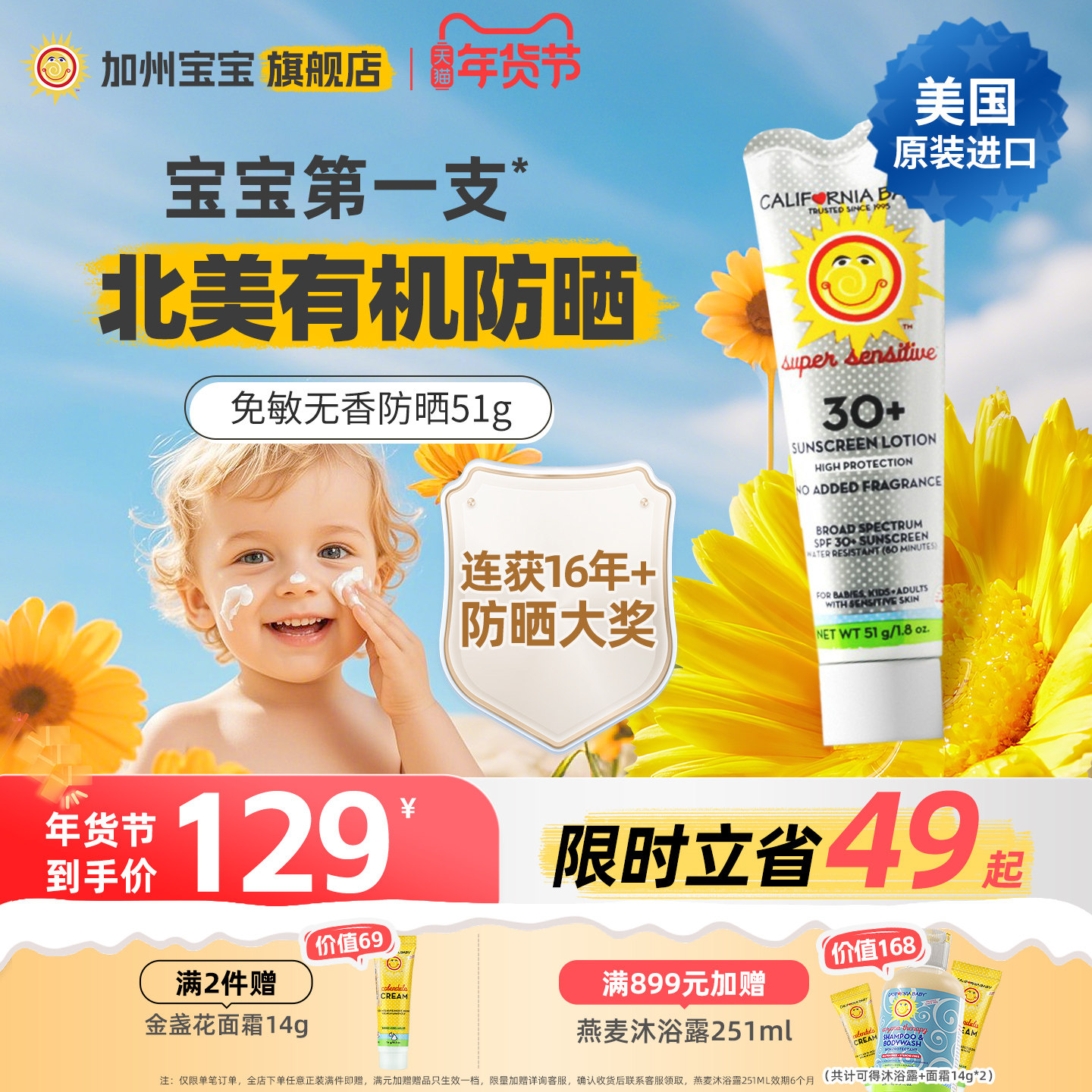 美国进口加州宝宝儿童防晒霜婴儿有机物理防晒乳隔离无香低敏宝宝