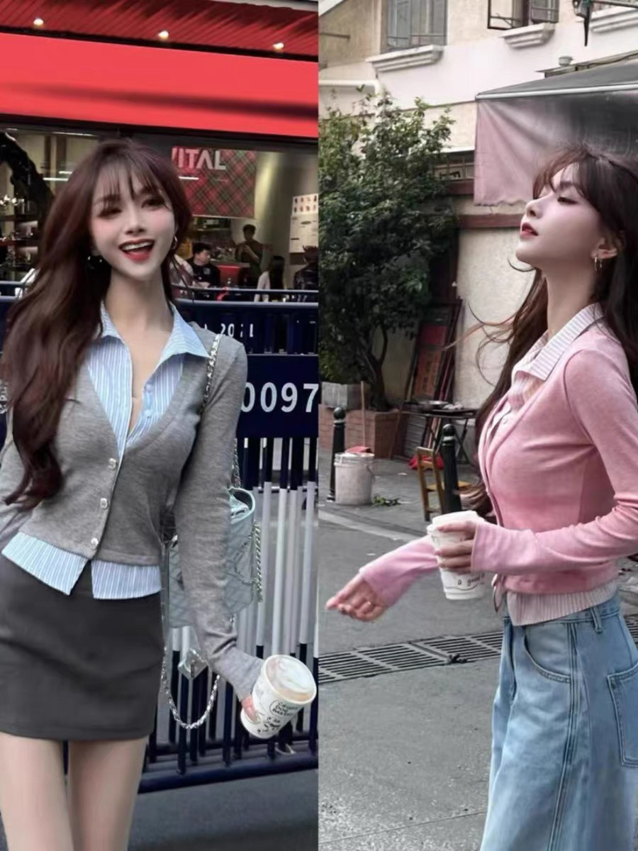 卡卡女装官方旗舰店正品早春新款假两件气质衬衫拼接针织开衫上衣