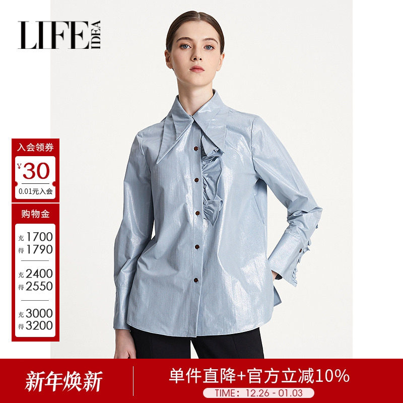 莱芙艾迪儿品牌翻领荷叶边设计衬衫春秋新款女装复古优雅气质衬衣
