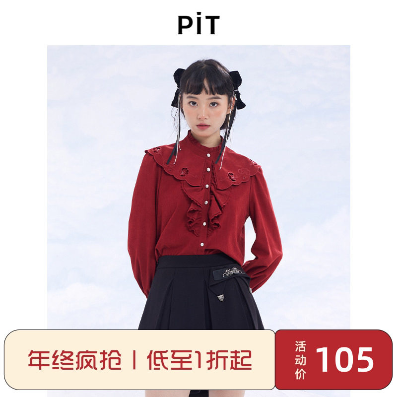 PIT法式复古木耳边长袖衬衫假两件撞色设计感条纹翻领上衣女秋冬