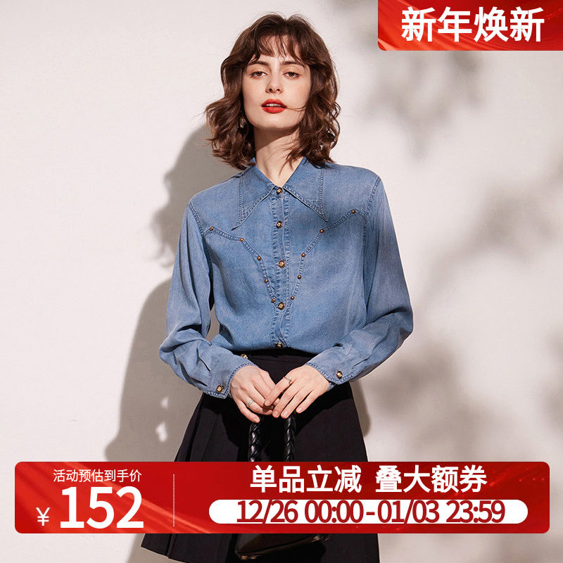 白鹿语小翻领波浪分割牛仔衬衣2025春季新款时尚撞钉装饰女式衬衫