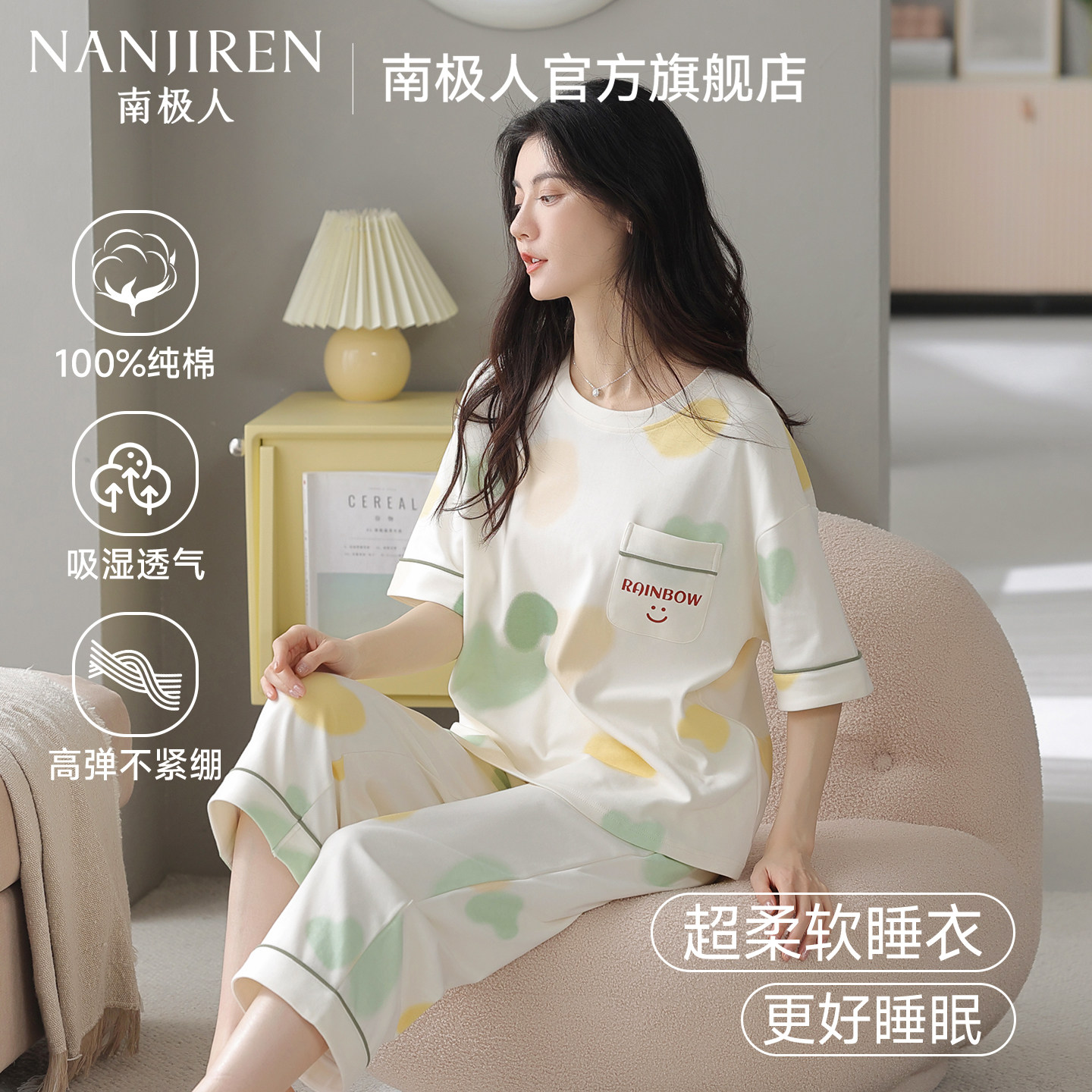 南极人睡衣女款2026新款高级感夏季纯棉短袖七分裤休闲家居服套装