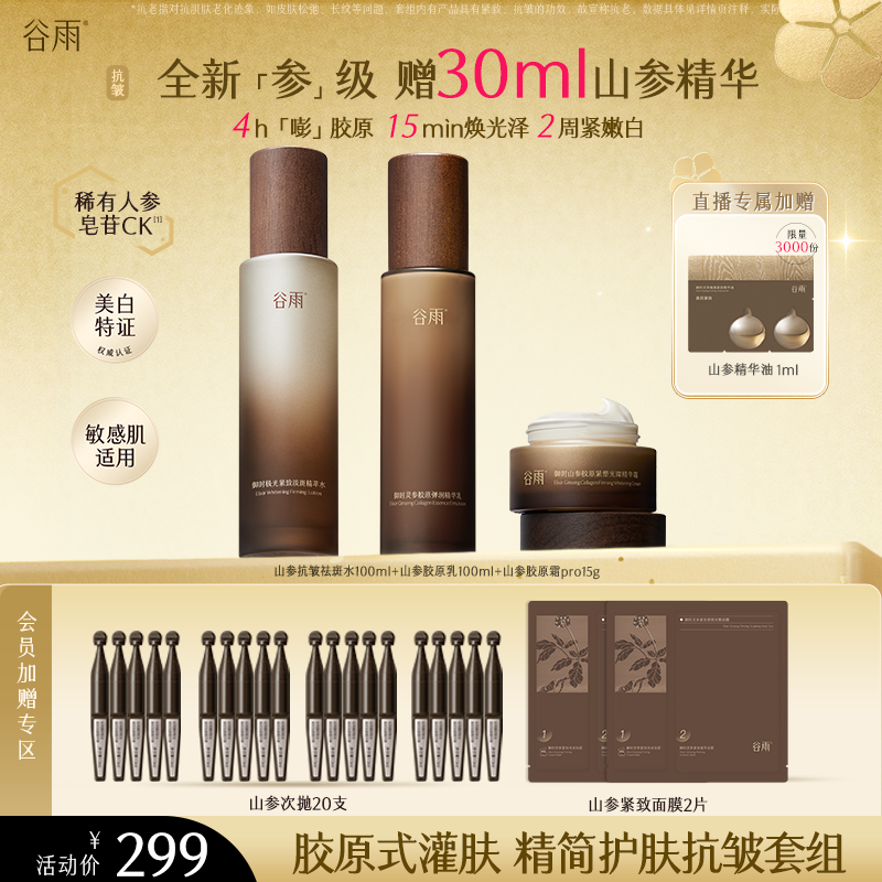 【店播精选】谷雨山参淡纹提拉紧致抗皱滋养改善暗沉补水保湿套装