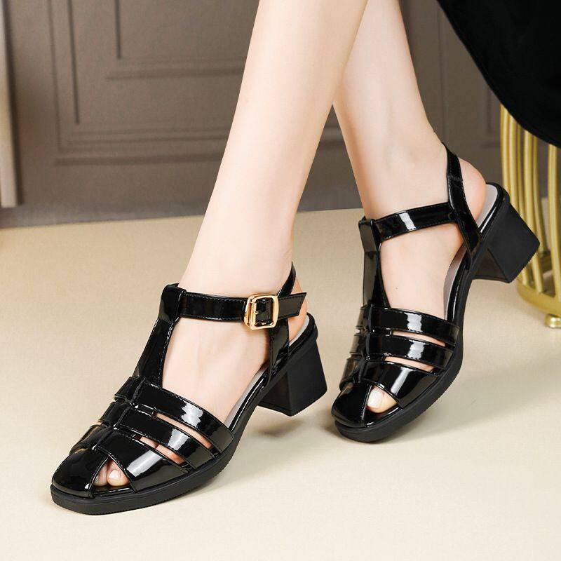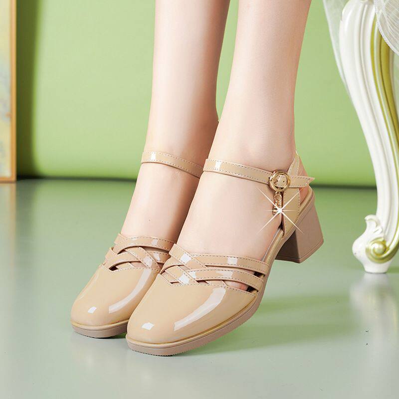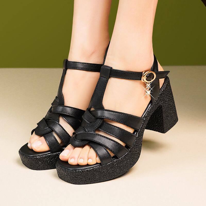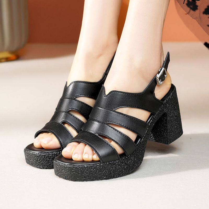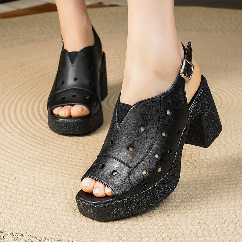 2024夏季新款女凉鞋真皮中跟时尚中年妈妈鞋一字扣镂空网纱高跟鞋