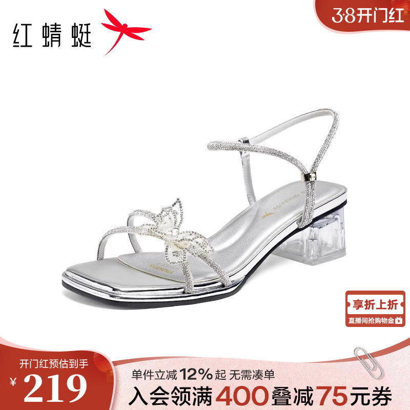 红蜻蜓一字带凉鞋2026夏季新款女凉鞋粗跟银色水钻通勤凉鞋时装凉