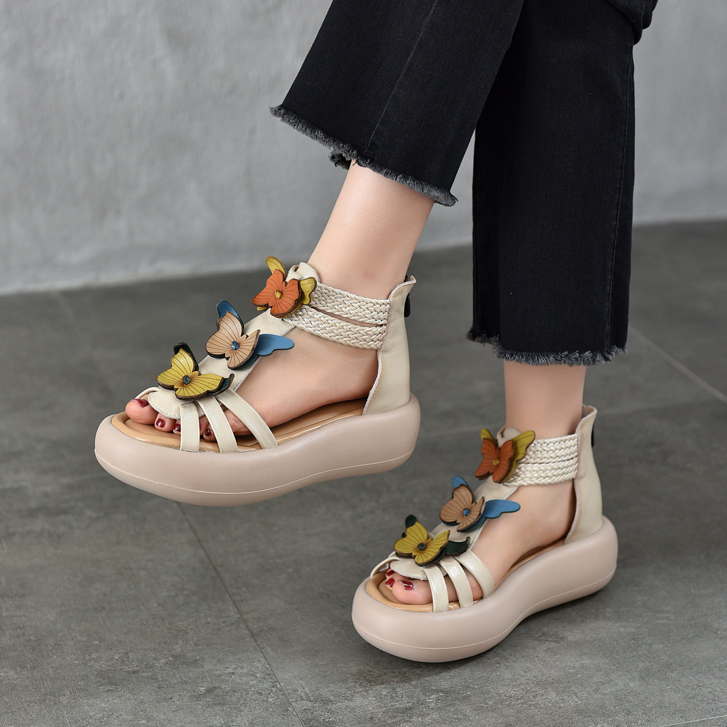 文艺复古高帮罗马凉鞋女厚底松糕真皮花朵凉靴女2025夏新款女凉鞋