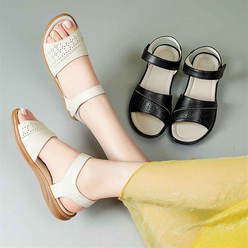 新款女凉鞋夏季真皮外穿镂空真皮软底防滑低跟平底中W老年妈妈凉