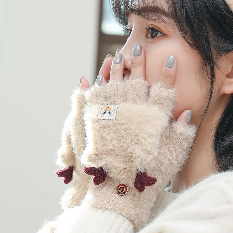 学生写字半指手套女冬骑行翻盖手套日系可爱加绒加厚保暖毛绒防风