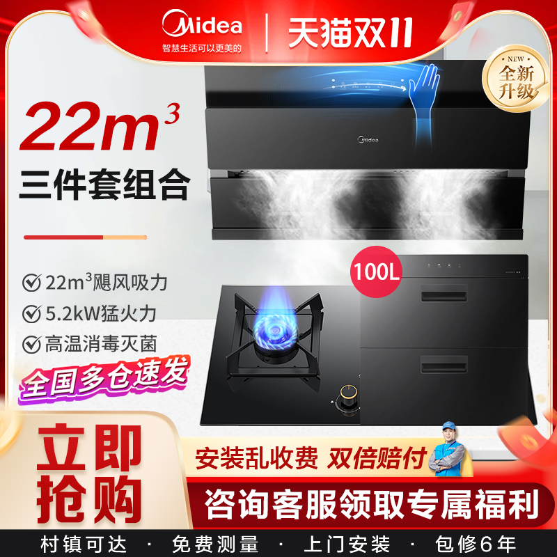 美的抽油烟机燃气灶套餐 大吸力烟灶消毒柜家用厨房组合三件套装