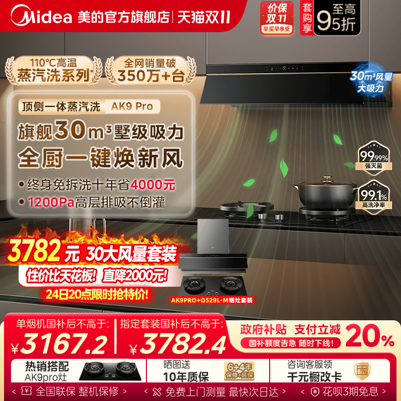 【加购24日直降2000】美的蒸汽洗AK9PRO油烟机家用厨房烟灶套装