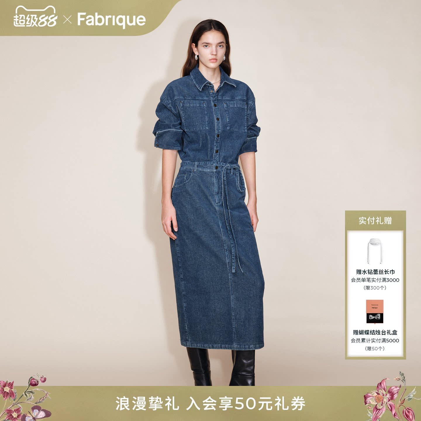 【江一燕同款】Fabrique牛仔蓝水洗灯芯绒长袖收腰修身衬衫连衣裙