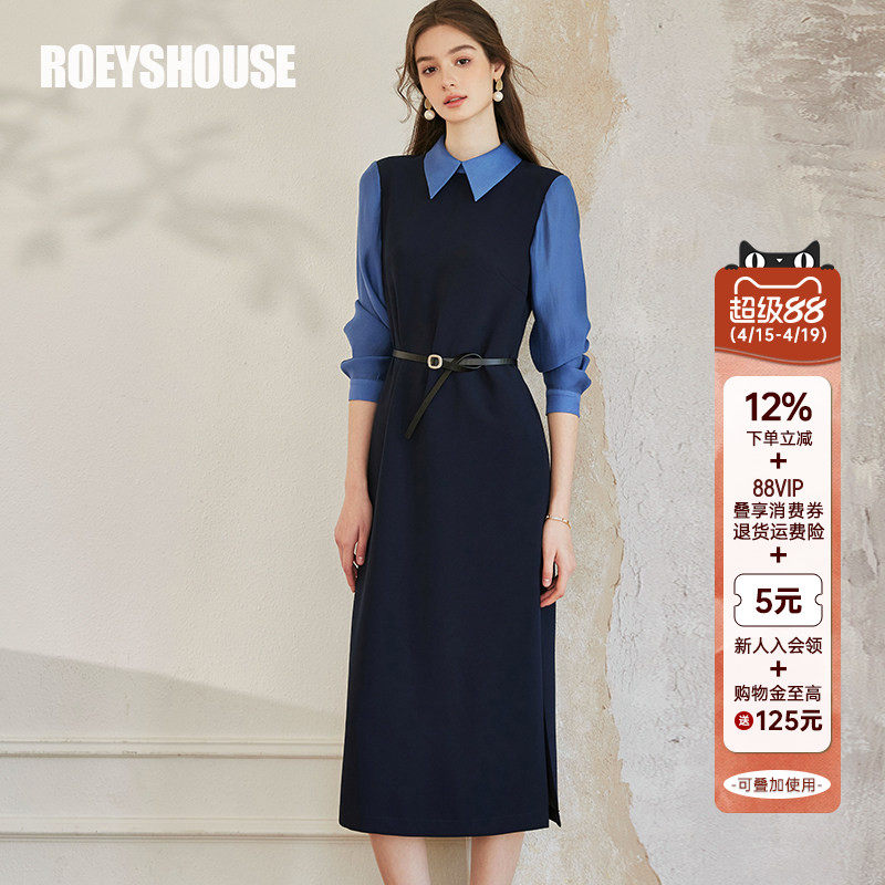 罗衣轻商务深蓝色修身连衣裙春高级设计感假两件衬衫直筒裙11686