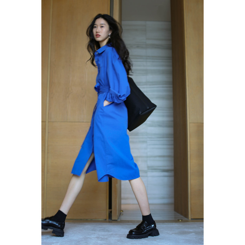 无有无印时髦克莱因蓝长袖泡泡袖修身宽松两穿衬衫连衣裙23253