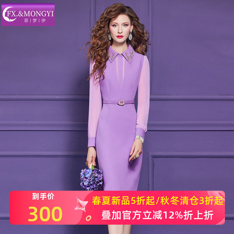 菲梦伊原创钉珠紫色衬衫连衣裙女春季大方得体优雅气质修身一步裙