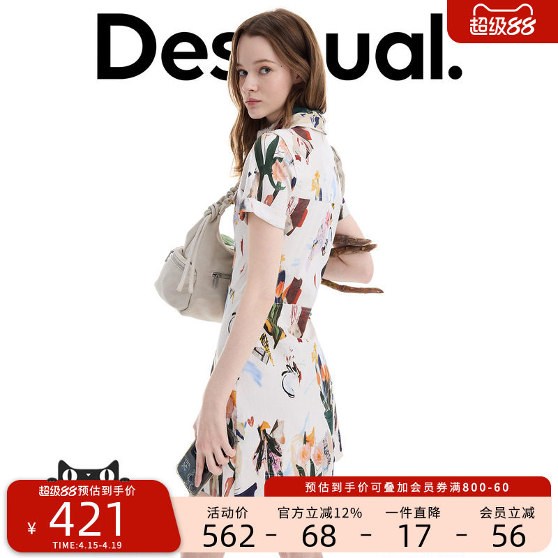 Desigual26春夏新品修身插画印花短袖衬衫裙女式连衣裙