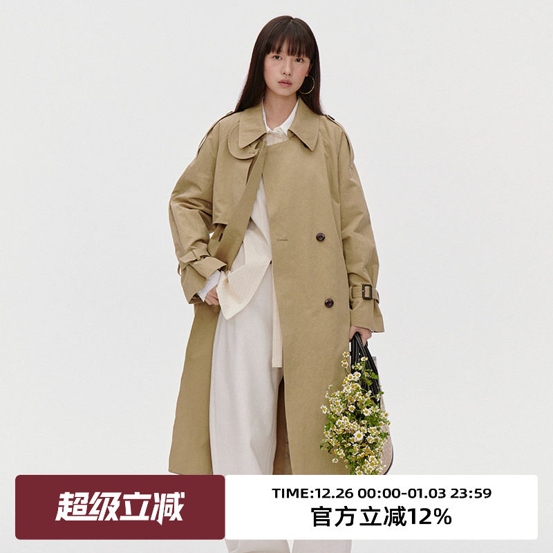贰羊设计【慕斯足迹】经典重工通勤翻领水洗棉双排扣长款风衣外套