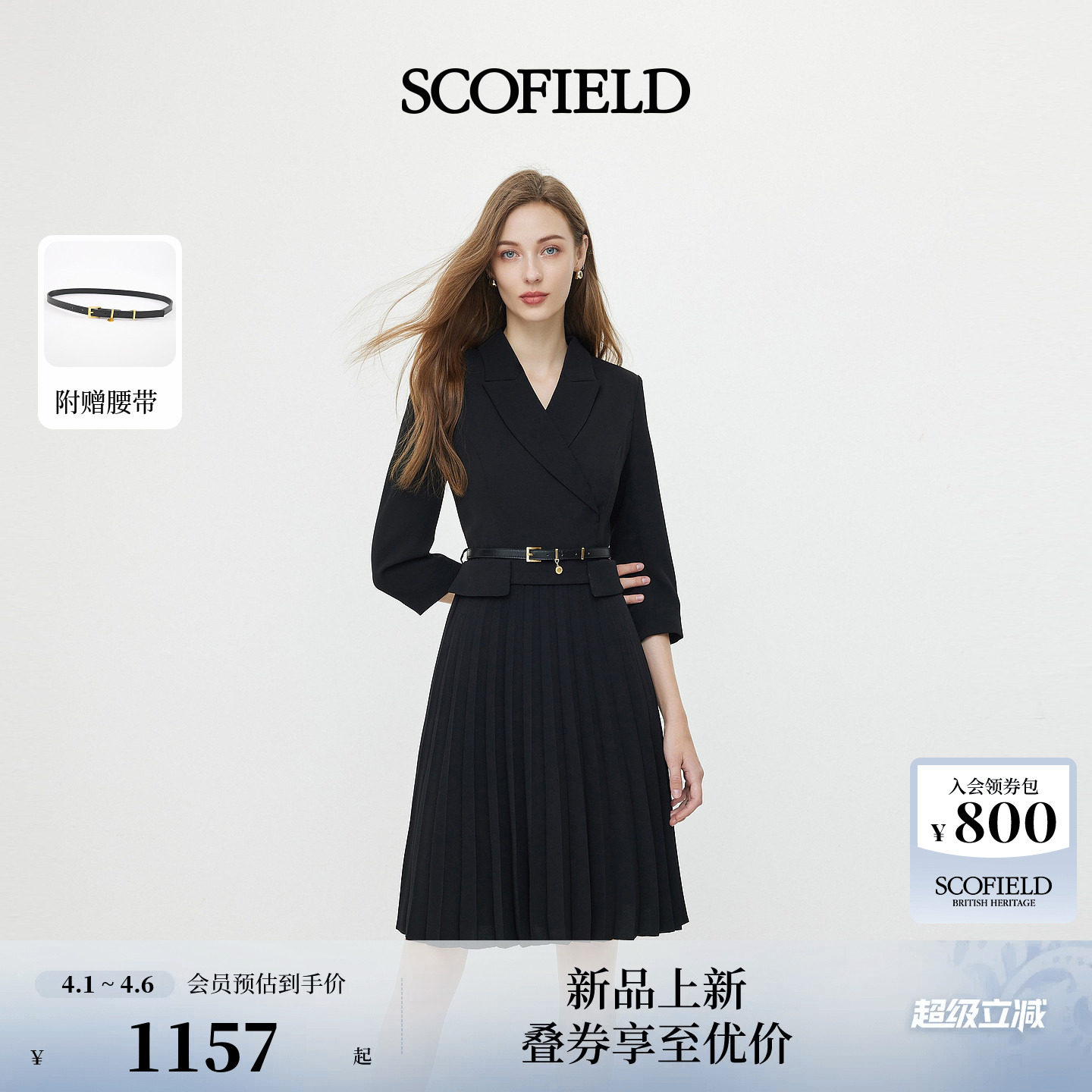 Scofield女装轻商务干练西装翻领连衣裙百褶中长裙2026春季新品